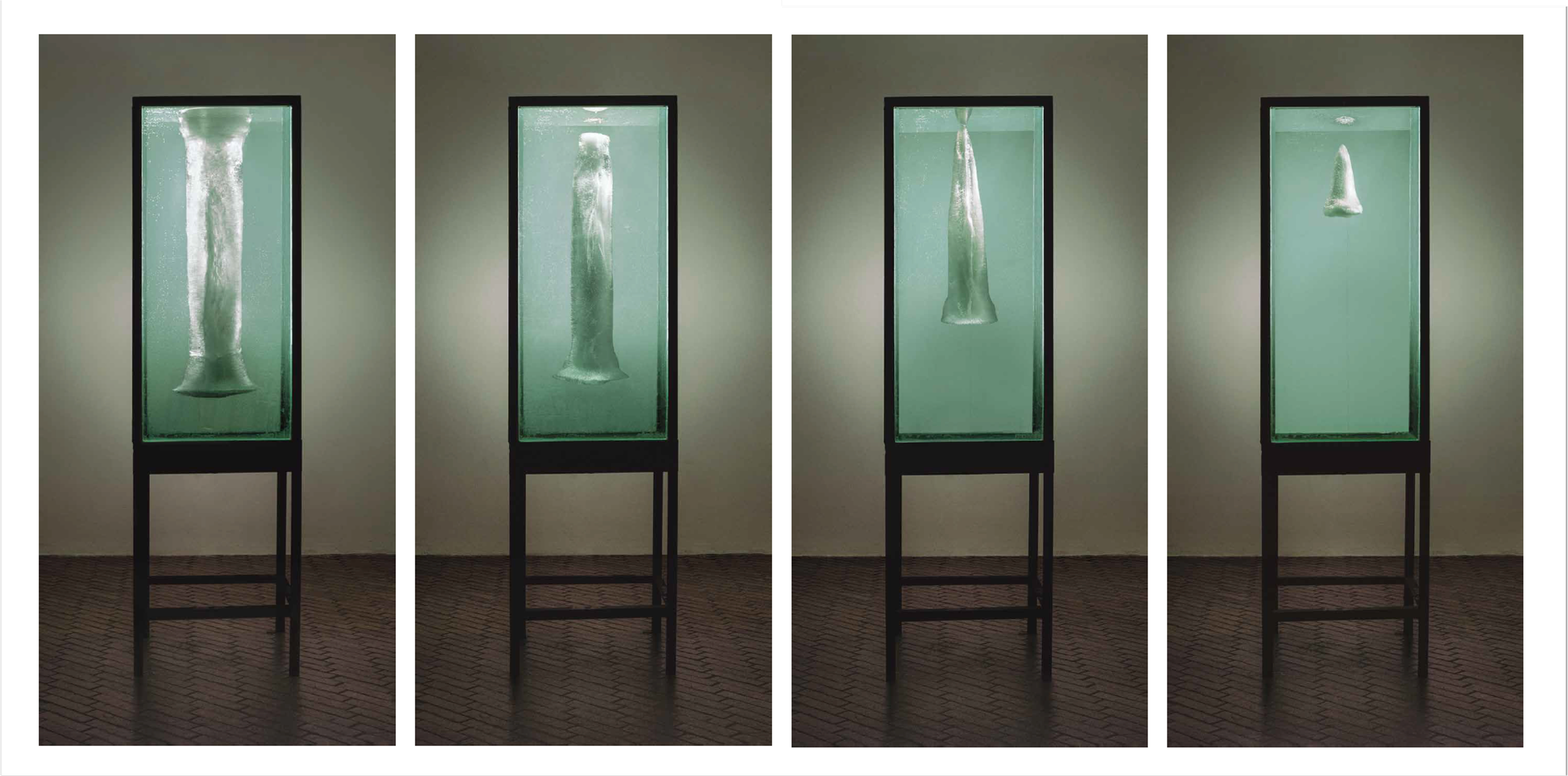 Una columna dórica de hielo (de 155 x 50 x50 cm y 300 kg), se diluye en una urna de vidrio llena de agua. La disolución total toma 20 horas en el curso de las cuales, la columna va perdiendo progresivamente sus contornos áureos, asumiendo formas orgánicas impredecibles. La disolución tiene un efecto efervescente ya que las partes blancas que vemos en el hielo semejantes a agujas, son partículas de aire que se van liberando en este proceso.